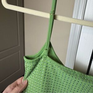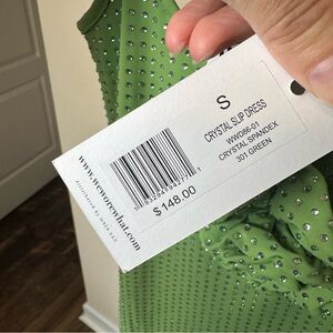 WeWoreWhat NWT Green Crystal Sleeveless Midi Slip Dress with Floral Detail in excellent, new with tags condition. Size small. Stylish green slip dress adorned with sparkling crystals. Ideal for a chic look. Flower is not “removable,” but could easily be removed and replaced with another crystal.