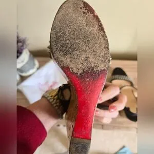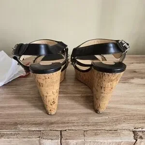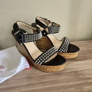 Authentic Christian Louboutin black leather wedge sandals with cork platform and silver studded straps. Signature red soles, size 7.5. Comes with original dust bag.