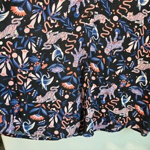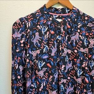 Vibrant blouse with a playful animal print. Features tigers and abstract designs. Perfect for a bold look.