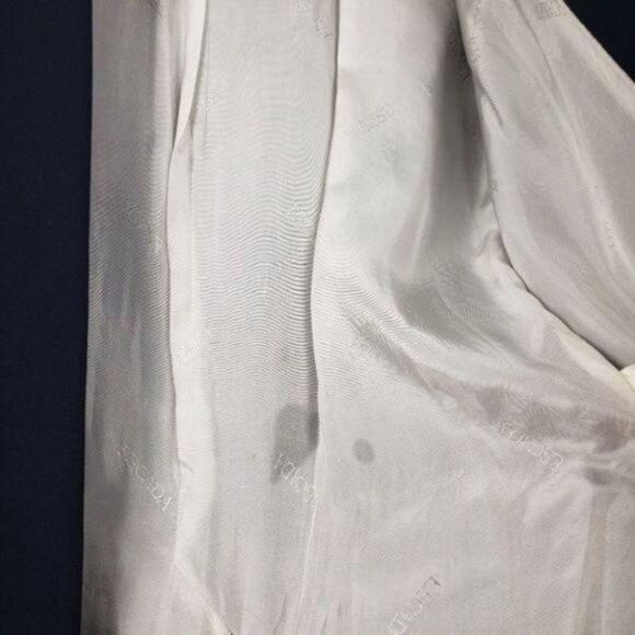 Rare Vintage West Germany designer military tuxedo-style jacket / blazer has shawl collar lapel open front. Tabbed feature at the shoulders and waist in the back. Fully lined. Front buttons for decorative purpose only. It has padded on shoulders and a small stain inside the lining see last photo.