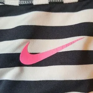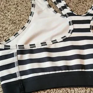 GUC, Experience the perfect blend of style and support with this Nike sports bra, featuring a sleek black and white stripped design. The wide straps and racerback style ensure optimal support, while the stretchy material offers comfort for both workouts and everyday wear. Nike Swoosh logo slightly cracked, see photos.