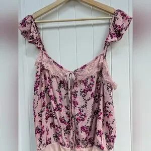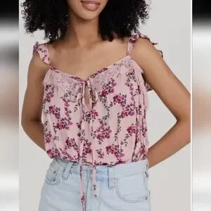 This charming new without tags bodysuit from Free People showcases a delightful floral patterned fabric, featuring a sleeveless design with lace and ruffles The light and airy fabric makes it perfect for warm weather, while the adjustable straps ensure a comfortable fit. snaps at the bottom.
