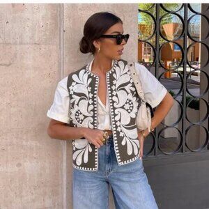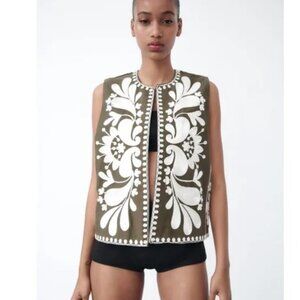 Zara CONTRAST EMBROIDERED VEST Olive Green/White Size M