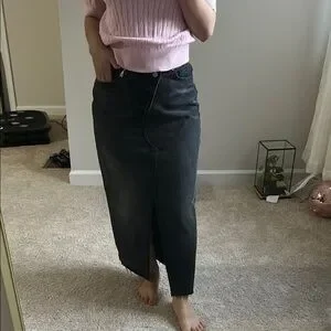 New with tag. Black denim skirt with front slit. Size 27. True to size. Length 35”. Waist 14.25”. Hips 18.5”. Non stretchy denim fabric. 67% organically grown cotton. 22% Tencel*Refibra Lyocell, 11% recycled cotton. Machine wash cold. In perfect new condition.