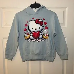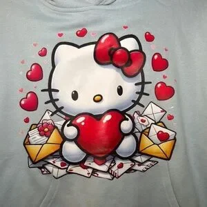 This charming Hello Kitty sweatshirt features a delightful design with Hello Kitty holding a red heart, surrounded by playful red and pink hearts. The pullover style with a hood and ribbed cuffs ensures comfort and warmth, making it a perfect addition to your casual wardrobe.