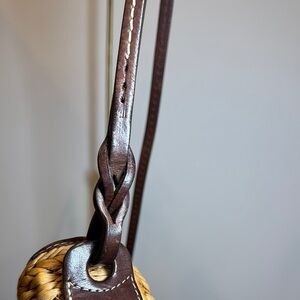 Leather straw, trim and shoulder strap. Measurements are approximately: W 9.5", H 8.5", Depth 3". Shoulder strap 12". Comes from dog friendly home. There is a stain, as shown in the pic, in the straw area of the purse.