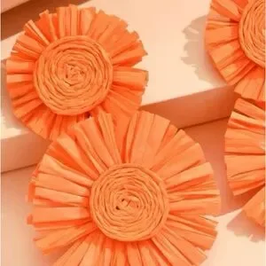 Embrace the carefree spirit of summer with these vibrant orange raffia earrings, perfect for your next beach getaway or a sunny day out. Each earring showcases a delightful double-flower design, crafted from woven raffia, creating a playful texture that evokes a laid-back, bohemian vibe.