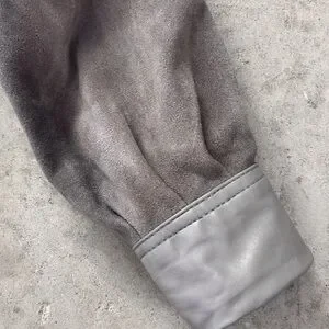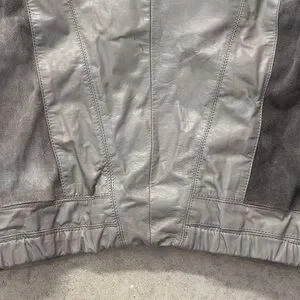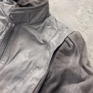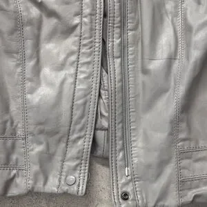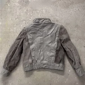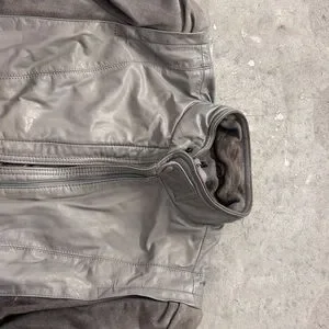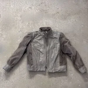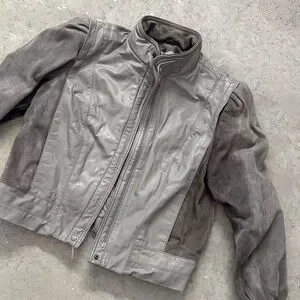 Gray Leather Jacket with Stand-Up Collar and Full-Length Zipper