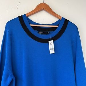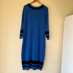 This elegant sheath dress from New York & Company features a striking blue hue complemented by black stripe accents. Designed with a classic crew neckline and long sleeves, it offers a sophisticated look suitable for both work and casual occasions. The streamlined silhouette ensures a flattering fit, making it a versatile addition to any wardrobe. Smoke and pet free home.