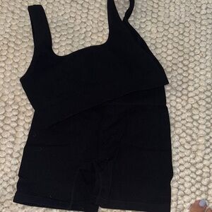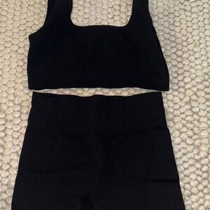 Experience comfort and style with this black workout set. Perfect for lounging or working out, this set offers a soft and snug fit. Elevate your workout wear collection with this versatile piece.