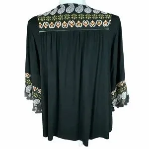 This cute women’s V-neck top features a ruched back seam and black tassel accents on each sleeve bottom. The pullover design is a blend of rayon, polyester and spandex for easy on and off. It is a size small and in excellent used condition. Please look over the pictures carefully and let me know if you have any questions. Bundle to save! 119