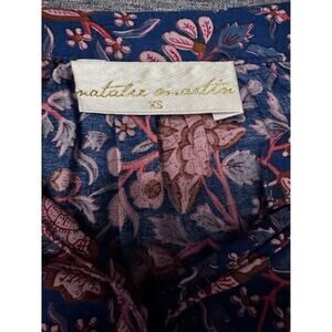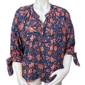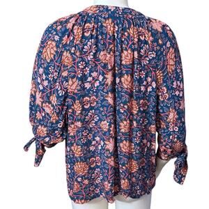 Natalie Martin top floral in shades of blue, pink,brown 3/4 Sleeve tie cuff XS