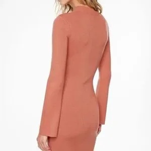 This stylish bodycon dress from Dynamite features a knit texture in a vibrant pink hue, perfect for casual or work settings. The long bell sleeves and mock neck add a touch of elegance to its form-fitting silhouette, making it a versatile addition to your wardrobe.