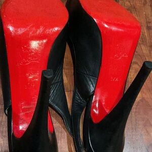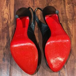 These Christian Louboutin heels feature a sleek black patent leather exterior with a chic peep-toe design. The slingback strap adds a touch of elegance, making them perfect for formal occasions. The light interior sole provides a subtle contrast, enhancing their sophisticated appeal. This Christian Louboutin is used but good condition the sole is repainted a little bit the size is marked 7/12 but fit like a size 7 please ask any question