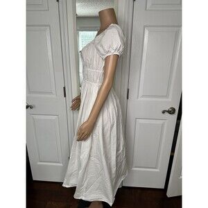 This beautiful white dress from Kate Spade is perfect for any occasion. The dress features a scoop neckline, short puff sleeves, and a pullover closure. The blouson style dress is made from 100% cotton and has a midi length. It is perfect for parties, cocktails, casual events, formal events, weddings, holidays, and more.