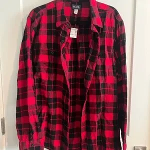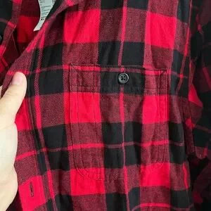 Casual button down shirt with plaid pattern. Features red and black colors. Perfect for everyday wear.