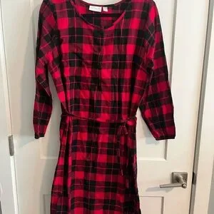 Stylish plaid dress. Long sleeves. Button front. Waist tie detail.