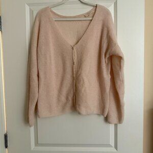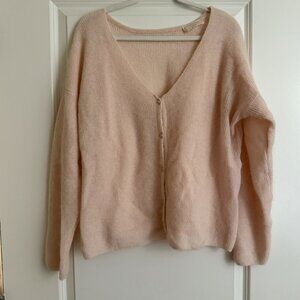 The famous Sezane Barry Cardigan -- it's gone viral several times alongside the Gaspard -- in the most gorgeous blush pink color with mother of pearl buttons. Can wear with the buttons in the front or the back so really two sweaters in one! Perfect weight for spring, summer, and fall.