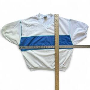 • Vintage short sleeve essential basic V-neck pullover terrycloth shirt/ sweatshirt in white with light blue stripe, chest pocket, and teal green piping. Material is more polo-like than sweatshirt. Vintage 90s, preppy, athletic, spring, summer, jock, sporty, casual vibes. Made in the USA.