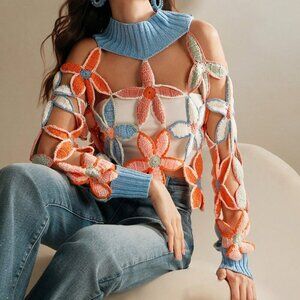 Blue Casual Women's Floral Pattern Sheer Long Sleeve Loose Sweater