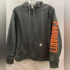 Stylish Carhartt hoodie in gray with bold orange logo on the sleeve. Comfortable and casual.