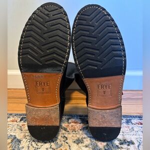 Sleek black leather Frye boots. Features adjustable buckle straps. Durable and stylish design.