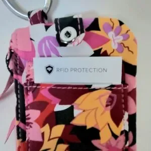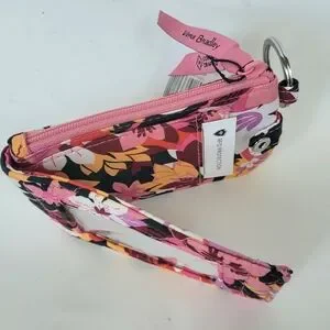 Vera Bradley cotton quilted deluxe zip ID case wallet with RFID protection and vibrant floral design. Features a logo keyring and clear ID window, zip compartment, bi-fold snap opening and 2 interior card pockets.