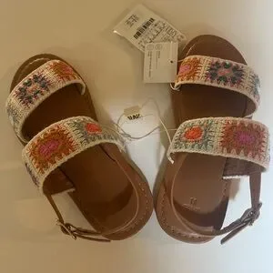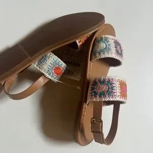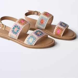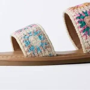 Double strap crocheted sandals. Side buckle closure. Flexible insole. Rubber sole. These stylish sandals from Zara feature a tan footbed and summer color accents, perfect for a casual summer look. The open-toe design and ankle strap ensure comfort and ease for all-day wear.