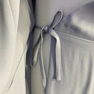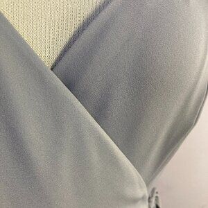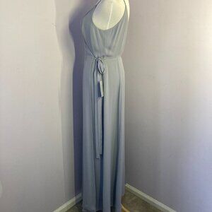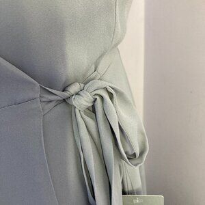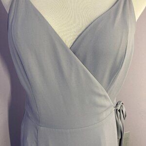 VNeck in front and back, with adjustable straps, tie at waist, and slit up side front of dress near tie