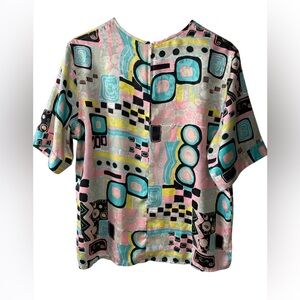Vintage poly short sleeve blouse in geometric print featuring pink/teal/yelllow/black hues.