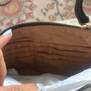Sleek and stylish black leather purse, perfect for any occasion. Features a convenient wrist strap for easy carrying, inside card slots, and inside zippered pocket. Comes with dust bag. NWT