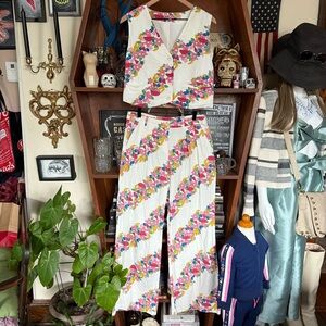 These pants showcase a lively diagonal stripe pattern with floral designs in pink and other vibrant colors. The full-length silhouette features a straight or slightly flared leg, ideal for a relaxed yet stylish appearance.