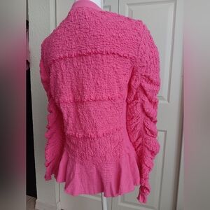 Vibrant Pink Textured Fabric with Ruffle Details. Raw Hems. Classic Fitted Style. Hook and eye front closure. Long sleeves with ruffled cuffs. So cute! No flaws.