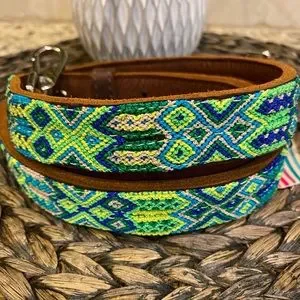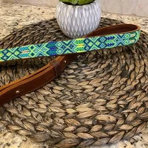 Enhance your wardrobe with the Consuela belt, showcasing a vibrant mix of green and blue tones. This accessory is crafted with attention to detail, featuring intricate geometric patterns that add a unique flair. Ideal for those looking to make a stylish statement.