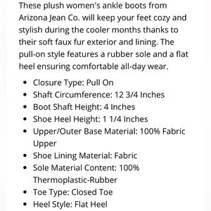 These plush women's ankle boots 🥾 from Arizona 🏜️Jean 👖 Co. will keep your feet cozy & stylish during the cooler months thanks to their soft faux fur exterior & lining. The pull-on style features a rubber sole & a flat heel ensuring comfortable all-day wear.