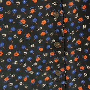 Madewell dress. Oversized, casual fit that looks great with a belt. The dress is black with orange and blue flowers. Buttons all the way from chest to hem. It hits right above the knees on a 5’2” frame. Unlined.