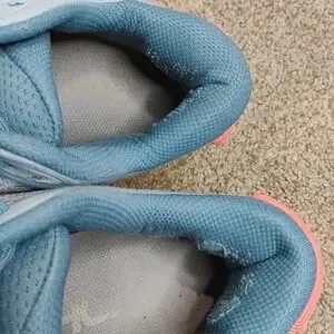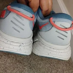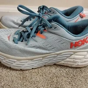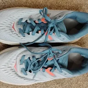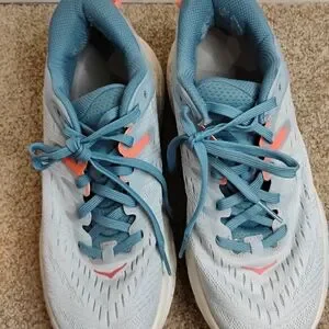 Stylish Hoka athletic shoes. Features a blue upper with coral accents. Comfortable and durable design.