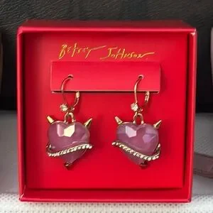 These Betsey Johnson earrings showcase a delightful heart-shaped design in pink with gold accents. The playful and feminine style is enhanced by the glossy enamel finish, making them a standout accessory. Perfect for adding a touch of charm to any outfit, these earrings dangle elegantly from gold-toned hooks.