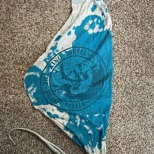 Vintage Diesel wrap scarf with blue design. Prominent 'Only The Brave' text. It’s a great style accessory.