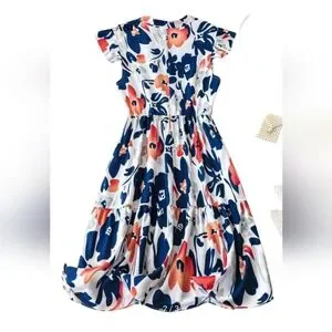NWOT Vibrant floral print. Short ruffled sleeves. V-neckline. Elastic waist. Perfect for casual outings.
