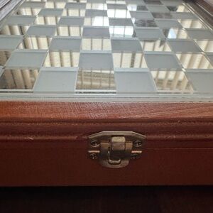 crystal clear chess game set for game night in wood box. Box has storage wear. All pieces are there.