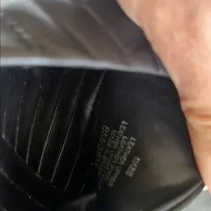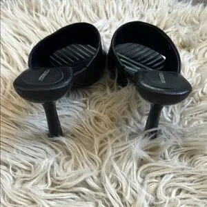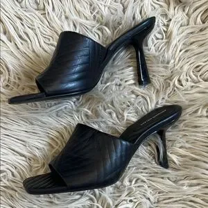 These black leather mules by ANTONIO MELANI feature a sleek, modern design with a quilted leather upper and diagonal stitching. The open toe and slip-on style offer a sophisticated look, while the medium-height stiletto heels add a touch of elegance.