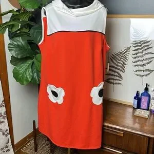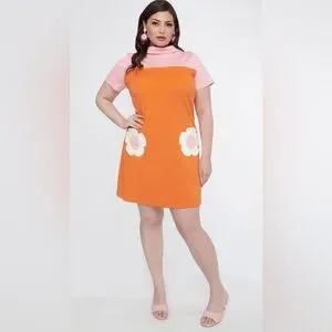 Vibrant orange dress with pink top and floral accents. Perfect for a bold look.
