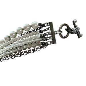 Mixed Beads Multistrand Tiered Necklace White Silvertone Pewter Oversize Lobster Clasp
