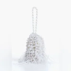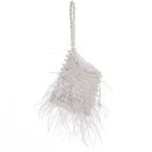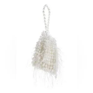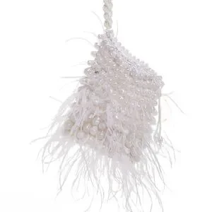 Chic clutch adorned with white beads and delicate feathers. Perfect for special occasions.