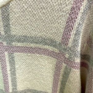 Stay cozy and stylish with this metallic grey and pink plaid sweater. Perfect for layering, this sweater adds a touch of elegance to any outfit.