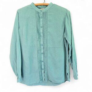 linen shirt, turquoise blouse, women's button-down, long sleeve top, pintuck shirt, casual top, mandarin collar shirt, breathable fabric, L.L.Bean shirt, lightweight shirt, medium size shirt, linen clothing, turquoise top, banded collar