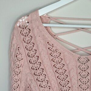 Altar'd State Pink Crochet Knit Crop Sweater Lace Up Back Bell Sleeve