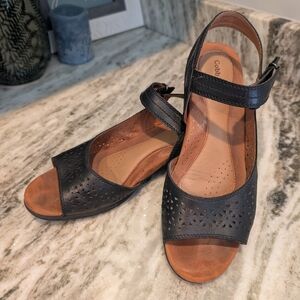 Experience the perfect blend of style and comfort with these Cobb Hill sandals. Featuring a sophisticated black leather upper with decorative cutouts, these sandals are designed for versatility. The low chunky heel and supportive footbed ensure all-day comfort, making them ideal for both casual and semi-dressy occasions.