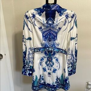 Elegant floral dress with vibrant blue and white pattern. Ideal for casual outings.